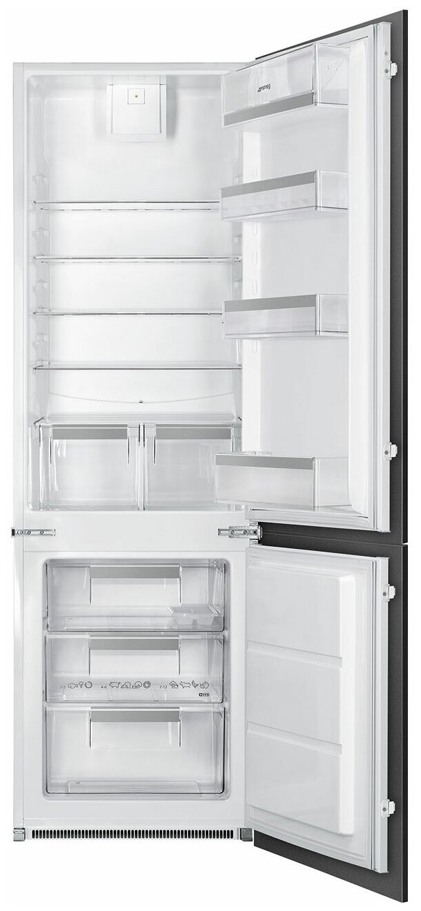 • На дверце расположены 3 полки: 1 регулируемая по высоте, 1 с прозрачной крышкой, 1 полка для бутылок